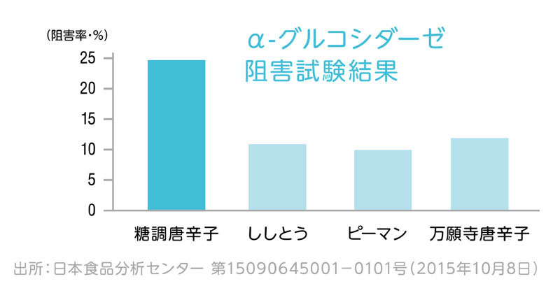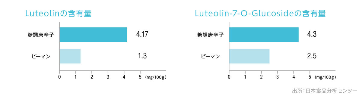 糖調唐辛子の機能性関与成分であるルテオリンを分析した結果、ピーマンに比べ含有量が高いことがわかりました。