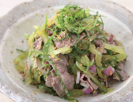 - 鍋に湯をわかして牛肉をしゃぶしゃぶにする。色が変わりはじめたらザルにあげ、粗熱がとれたら1cm幅に切る。