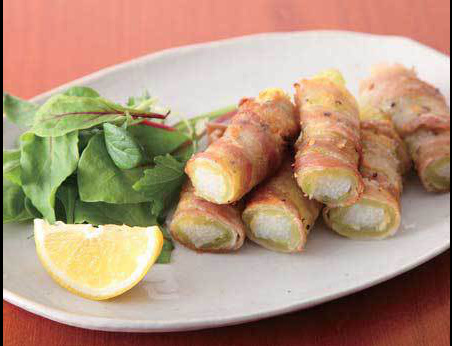 - 糖調唐辛子を縦半分に切る。長いもとショウガをはさんで1.で巻く。